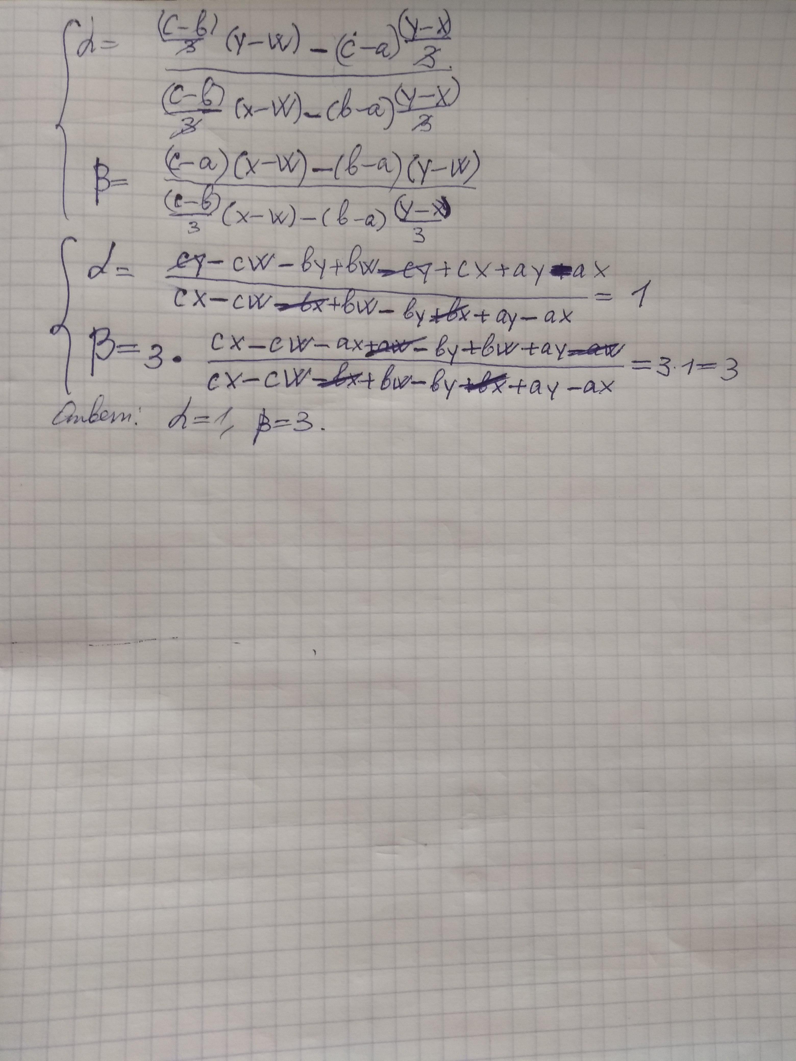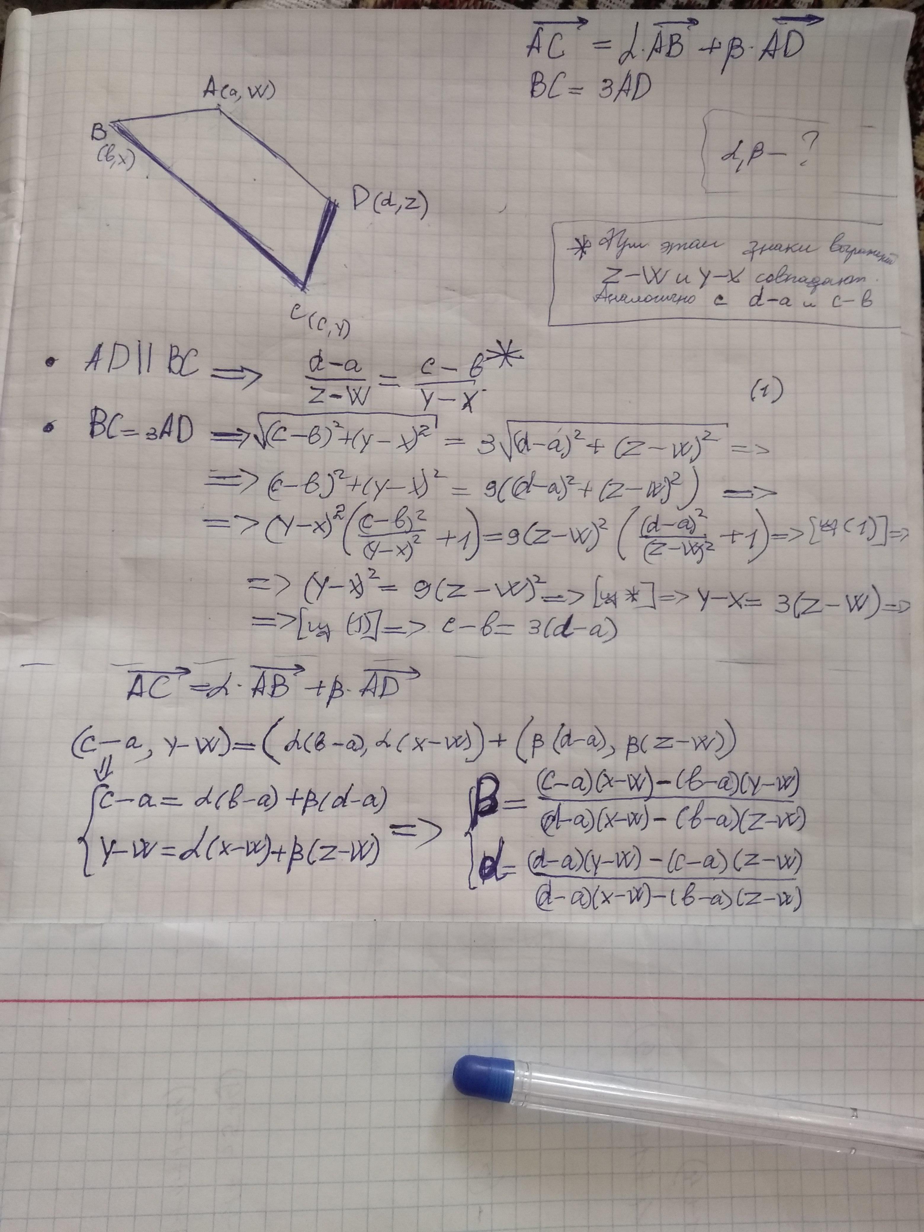 В трапеции ABCD длина основания BC в 3 раза больше длины основания AD. Пусть AC=αAB+βAD. Найдите α и β. (AC,AB,AD-это векторы)