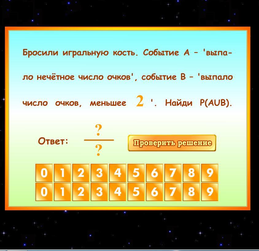 Вероятность события А: P(A) = 3/6 = 1/2. Вероятность события B равна P(B) = 1/6. Воспользовавшись свойством вероятности объединении двух событий, мы получим