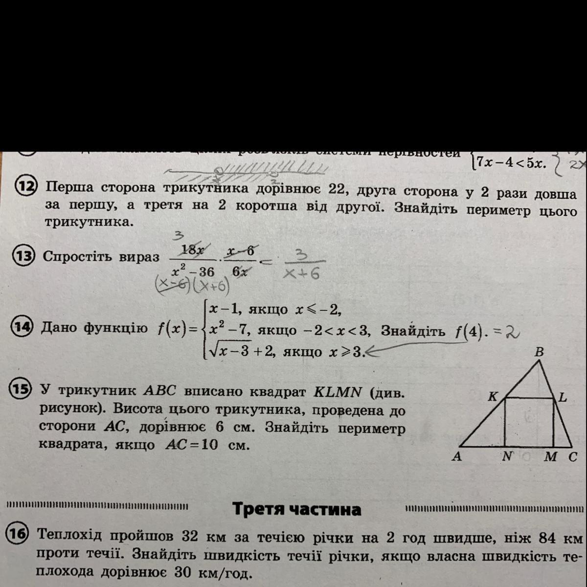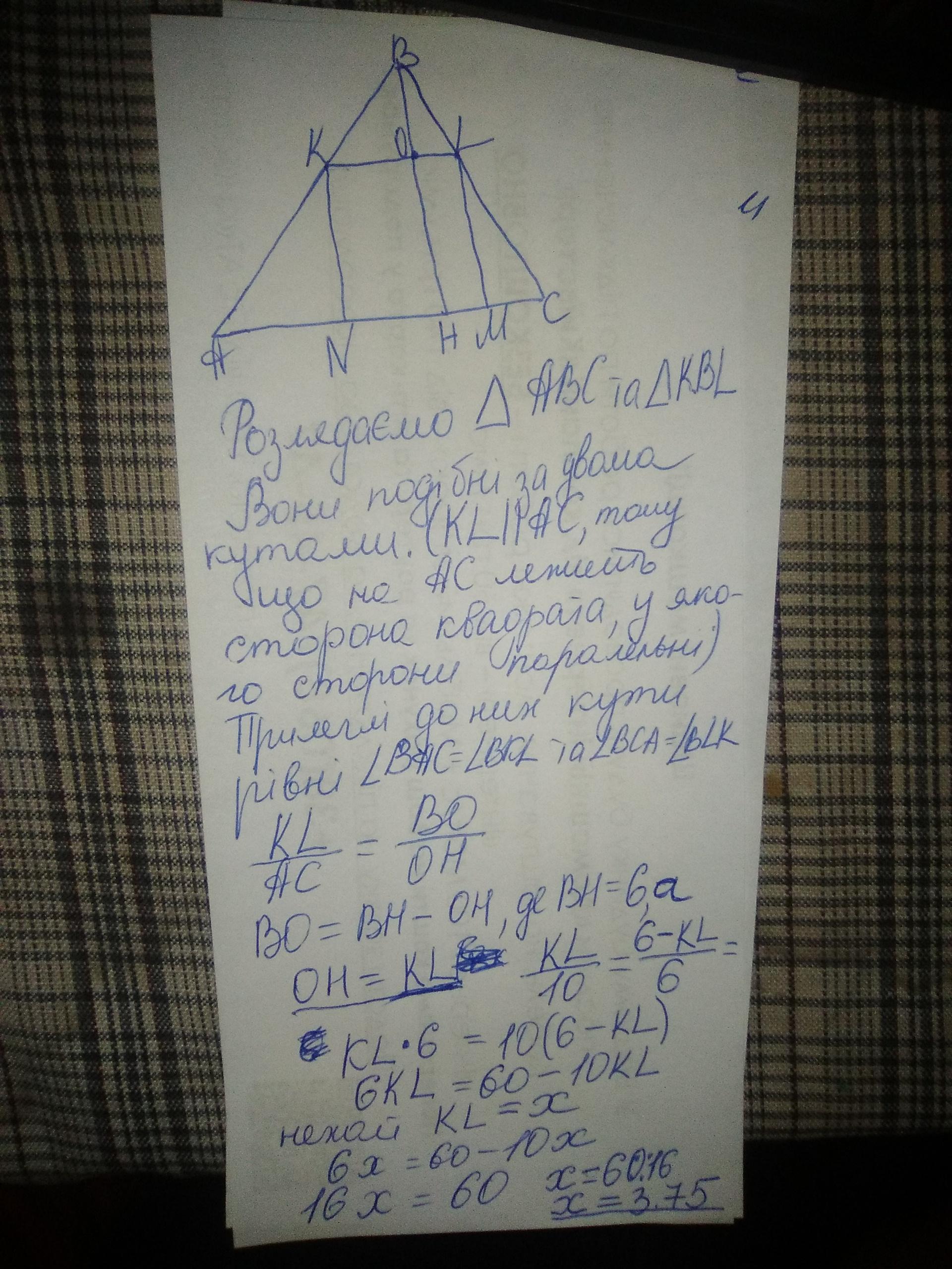 у трикутник ABC вписано квадрат KLMN. Висота цього трикутника, проведена до сторони AC, дорівнює 6 см. Знайдіть периметр квадрата, якщо AC=10 см