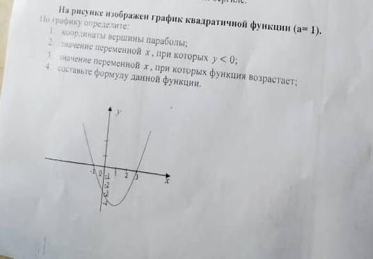 4. у=(х-х₀)²+у₀, здесь х₀=1; у₀=-4 координаты вершины, равскрывая скобки, получич у=(х-1)²-4; у=х²-2х+1-4, упрощая, имеем у=х²-2х-3