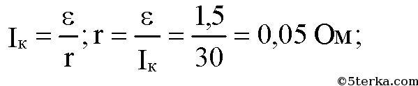 ЭДС сухого элемента 1,5 В. Ток короткого замыкания равен 30 А. Чему равно внутреннее сопротивление элемента? Каким будет напряжение на его полюсах, если замкнуть элемент на катушку сопротивлением 1 Ом
