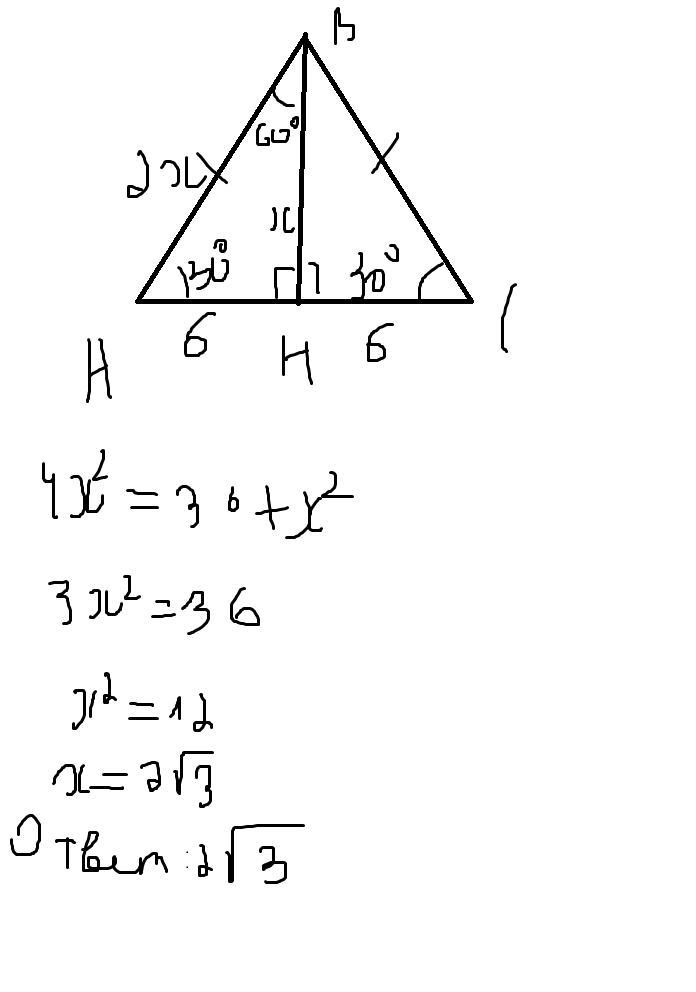 Найдите высоту,проведённую к основанию равнобедренного треугольника,если основание равно 12,а угол при основании равен 30