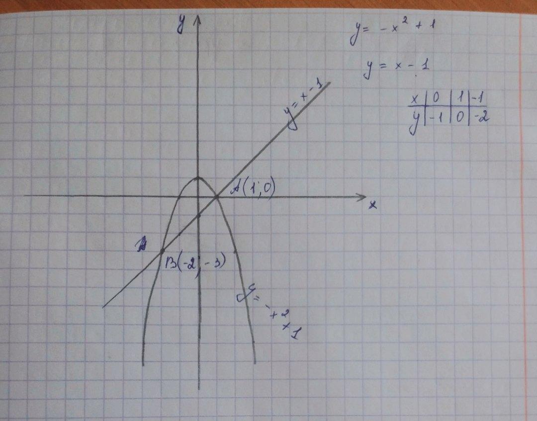 постройте график функции y=-x^2+1 y=x-1 и укажите координаты точек пересечения этих графиков​