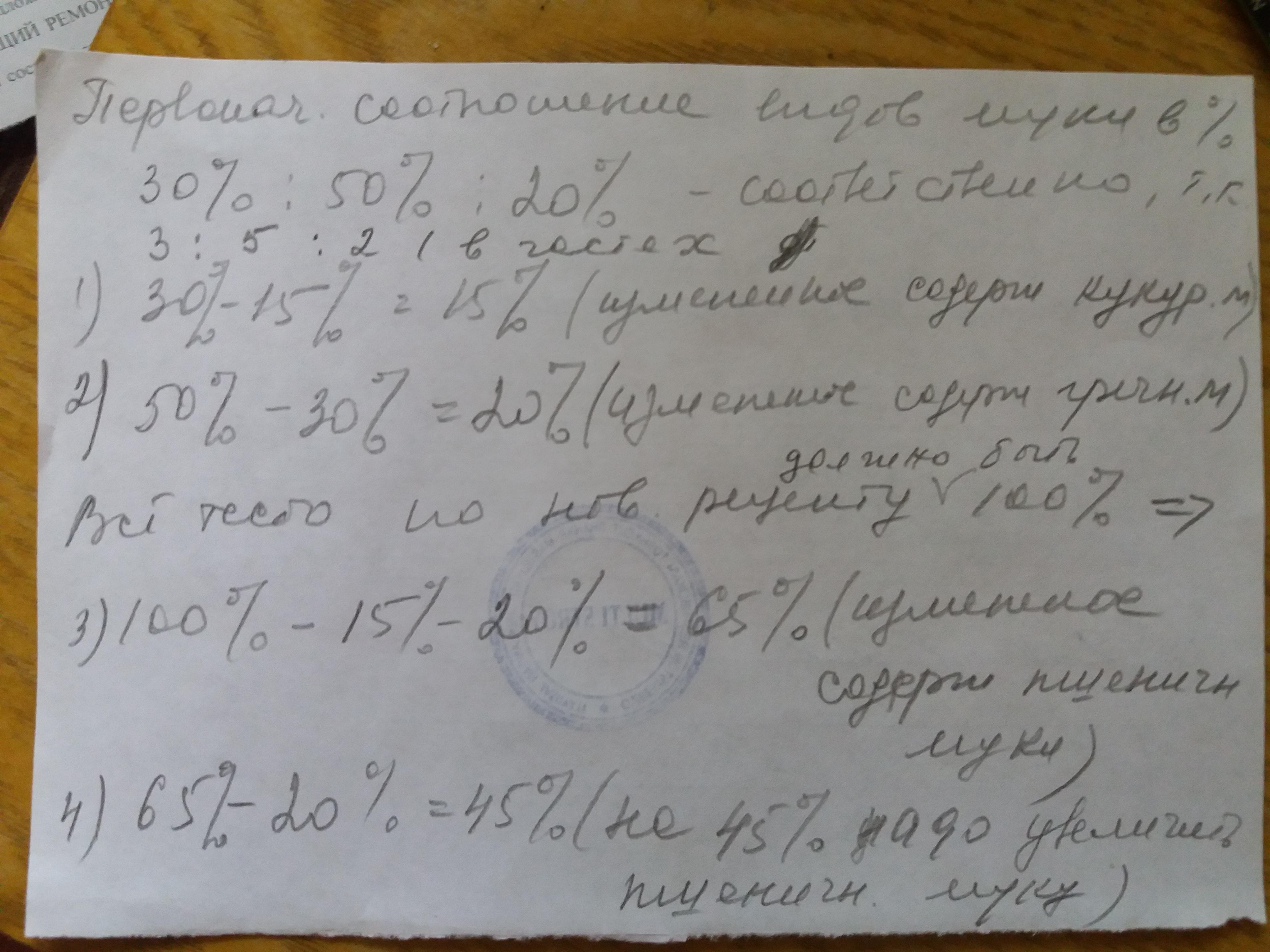 При изготовлении пирога по древнему рецепту используется три вида муки: кукурузная, пшеничная и гречневая. Их массы относятся как 3 : 5 : 2 соответственно. Один повар решил поэкспериментировать с рецептом. Он уменьшил на 15% содержание кукурузной муки и на 30% гречневой муки. На сколько процентов ему нужно увеличить содержание пшеничной муки, чтобы общая масса трех видов муки осталась неизменной?