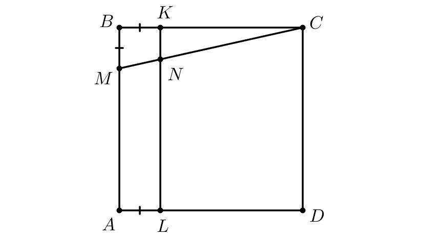 На сторонах AB, BC и AD квадрата ABCD выбраны точки M, K, L соответственно так, что AL=BM=BK. Отрезки KL и CM пересекаются в точке N. Выберите 4 точки, являющиеся вершинами треугольника и его ортоцентром соответственно.