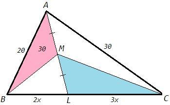 Точка M — середина биссектрисы AL треугольника ABC. Известно, что AB=20, AC=30, а площадь треугольника ABM равна 30. Найдите площадь треугольника MLC