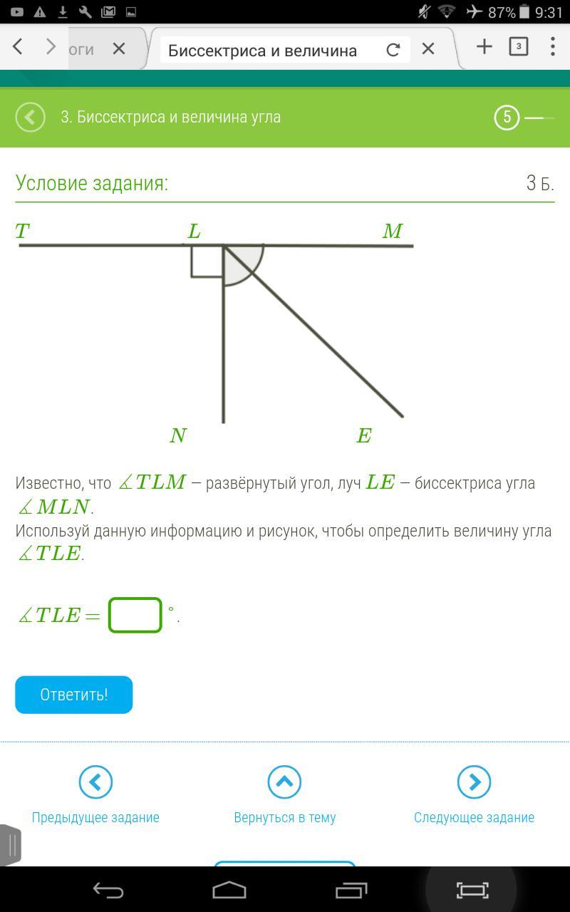 Известно, что ∡TLM — развёрнутый угол, луч LE — биссектриса угла ∡MLN.