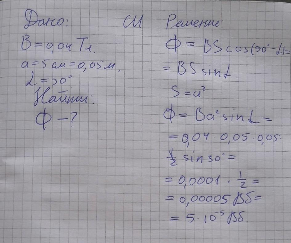 В однородном магнитном поле с индукцией B=0.04 Тл находится плоский контур, сторона которого a=5см.Плоскость контура составляет α=30° с направлением магнитного поля B. Определить магнитный поток, пронизывающий контур. Срочно!!!