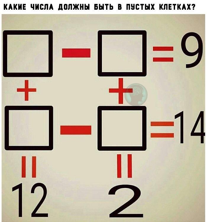 это задача на логику, нужно подставлять числа в клетки так чтобы получилось правильное равенство. Можно пользоваться любыми числами типа отрицательными, целыми, нецелыми и тд
