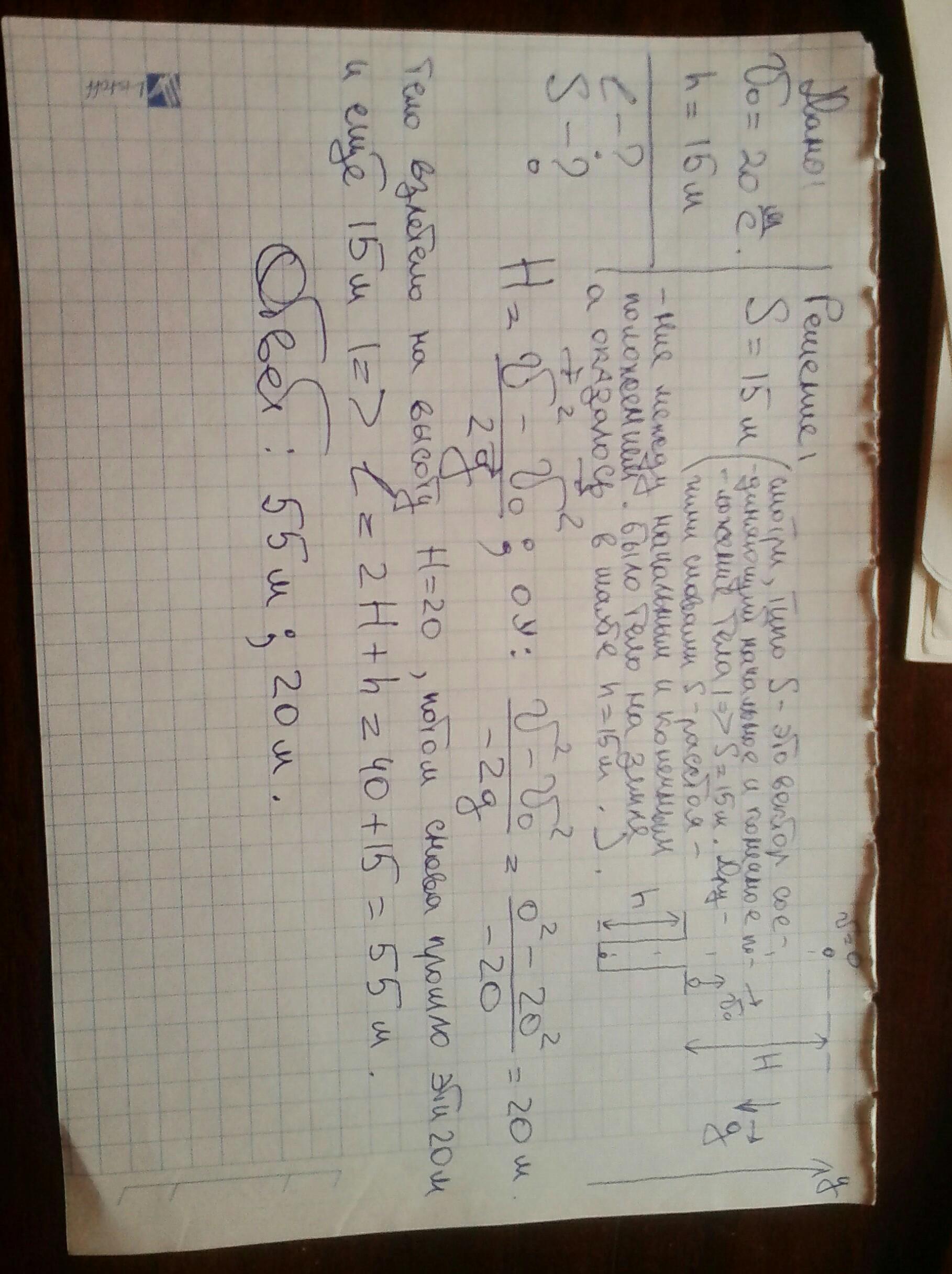 тело брошено вертикально вверх со скоростью 20 и упало в шахту глубиной 15 м