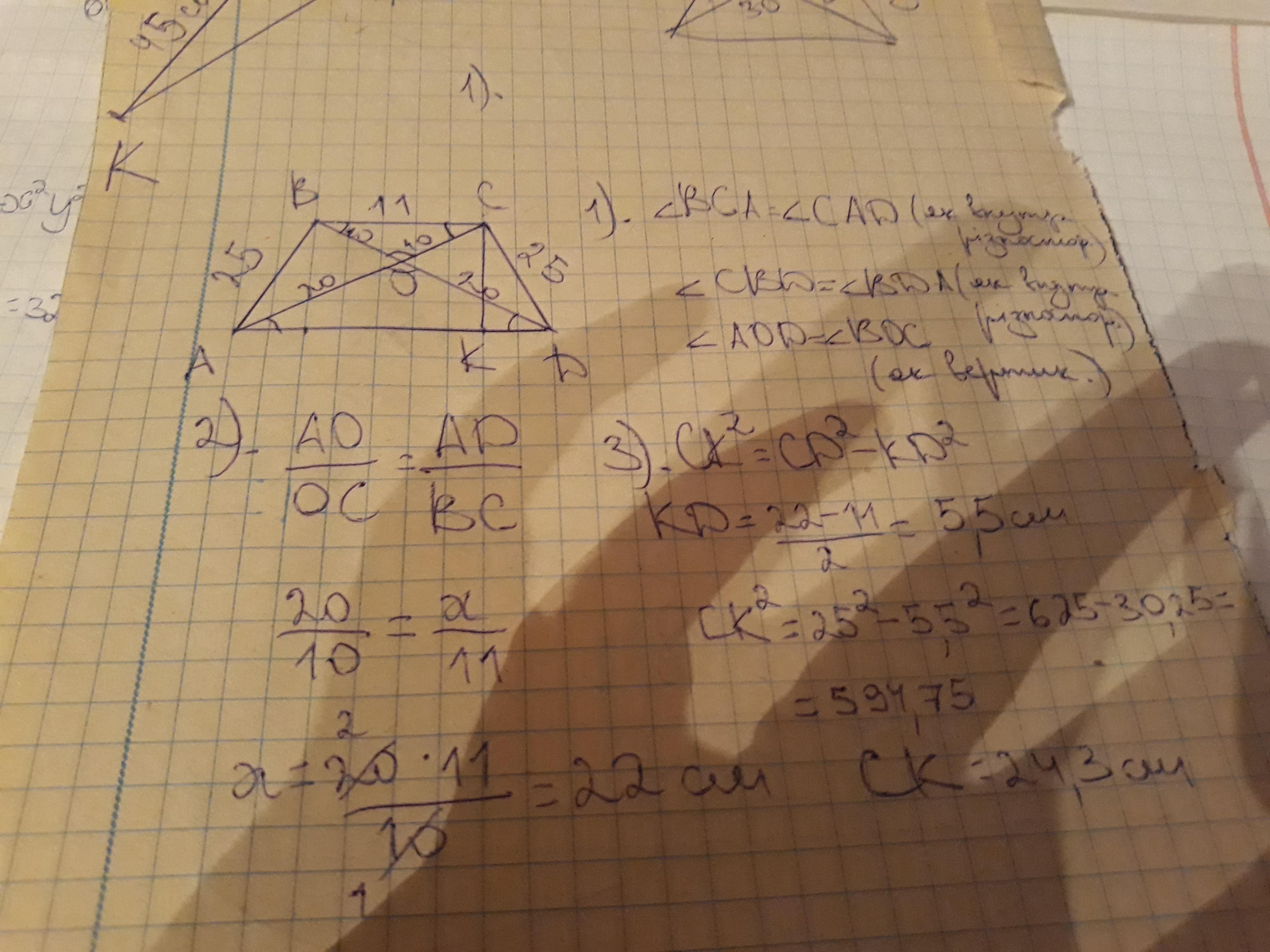 у рівнобічній трапеції бічна сторона становить 25 см,а діагональ-30см, а менша основа 11см.Знайти висоту