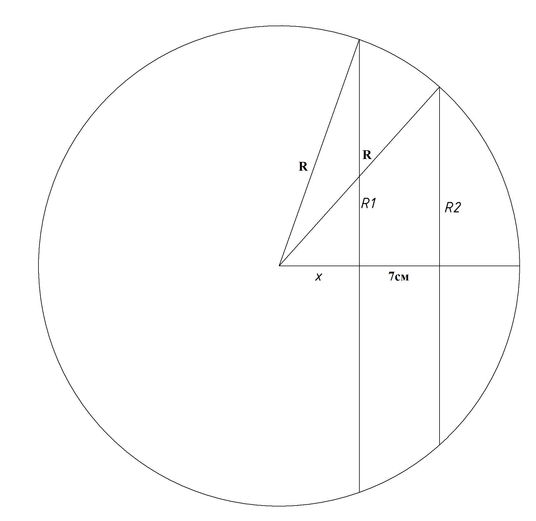 Сечения сферы двумя параллельными плоскостями имеют длины 10пи и 24пи, расстояние между сечениями 7 см, их центры лежат на одном радиусе найдите площадь сферы