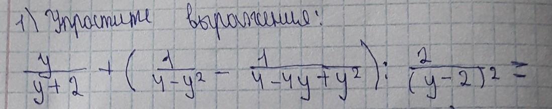 y/(y+2) + (1/4-y2 - 1/4-4y+y2) : 1/(y-2)2 = y/(y+2) - (1/(y-2)(y+2) - 1/(y-2)2) : 1/(y-2)2 = y/(y+2) - (y-2-y-2)/((y-2)2(y+2)) : 1/(y-2)2 = y/(y+2) + 4/((y-2)2(y+2)) : 1/(y-2)2 = y/(y+2) + 4/(y+2) = (y+4)/(y+2)
