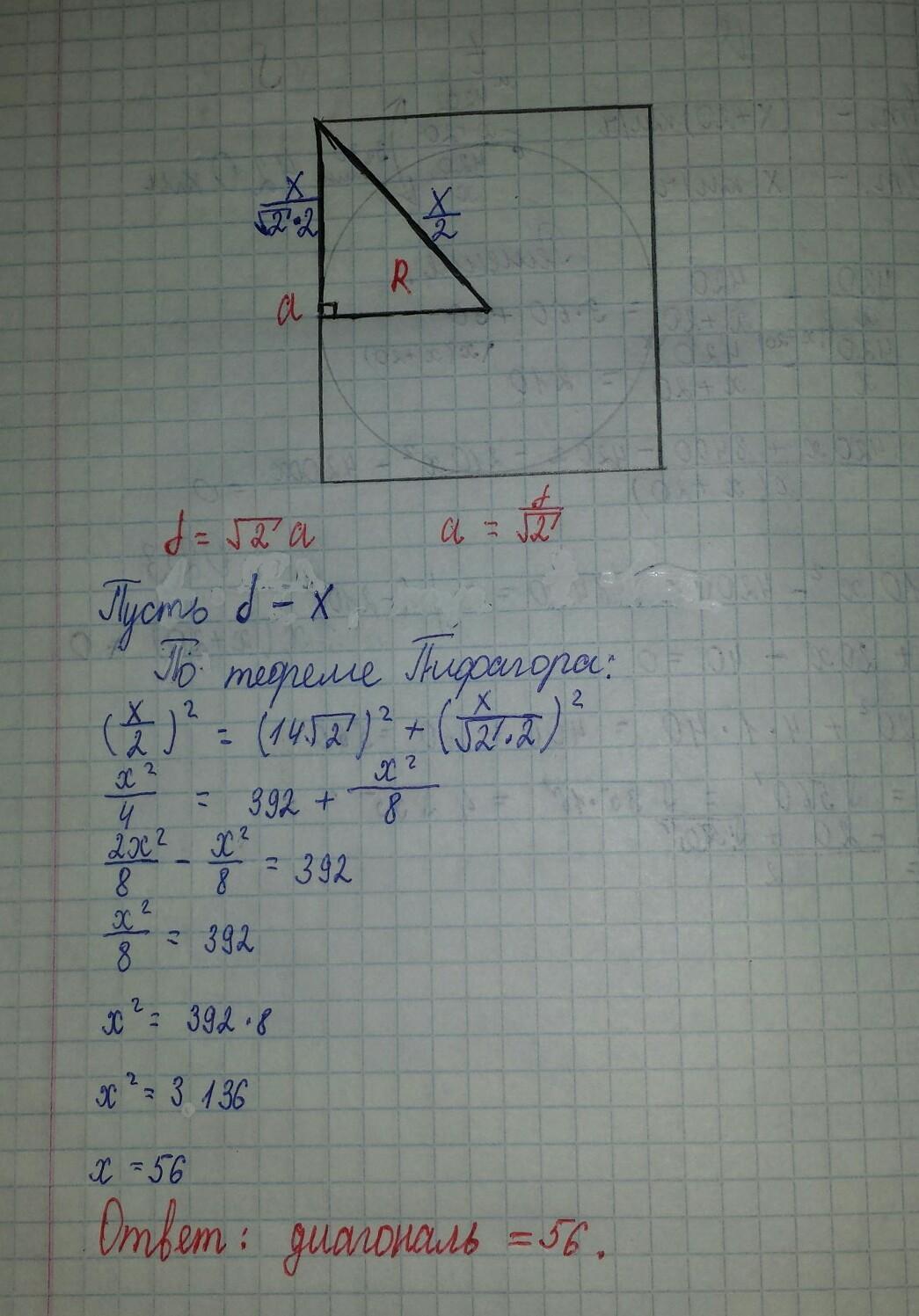 Радиус вписанной в квадрат окружности равен 14 корень из 2 Найдите диагональ этого квадрата