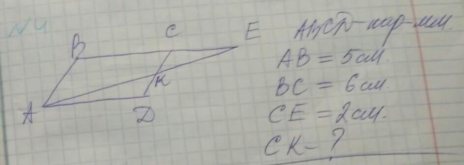 <В=<С, <Е -общий, значит СЕК~ВЕА, тогда СК/АВ=СЕ/ВЕ, СК= 5*2/8= 1.25см