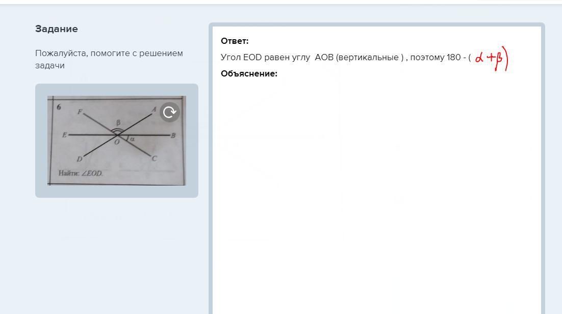 Угол EOD равен углу AOB (вертикальные ) , поэтому 180 - (