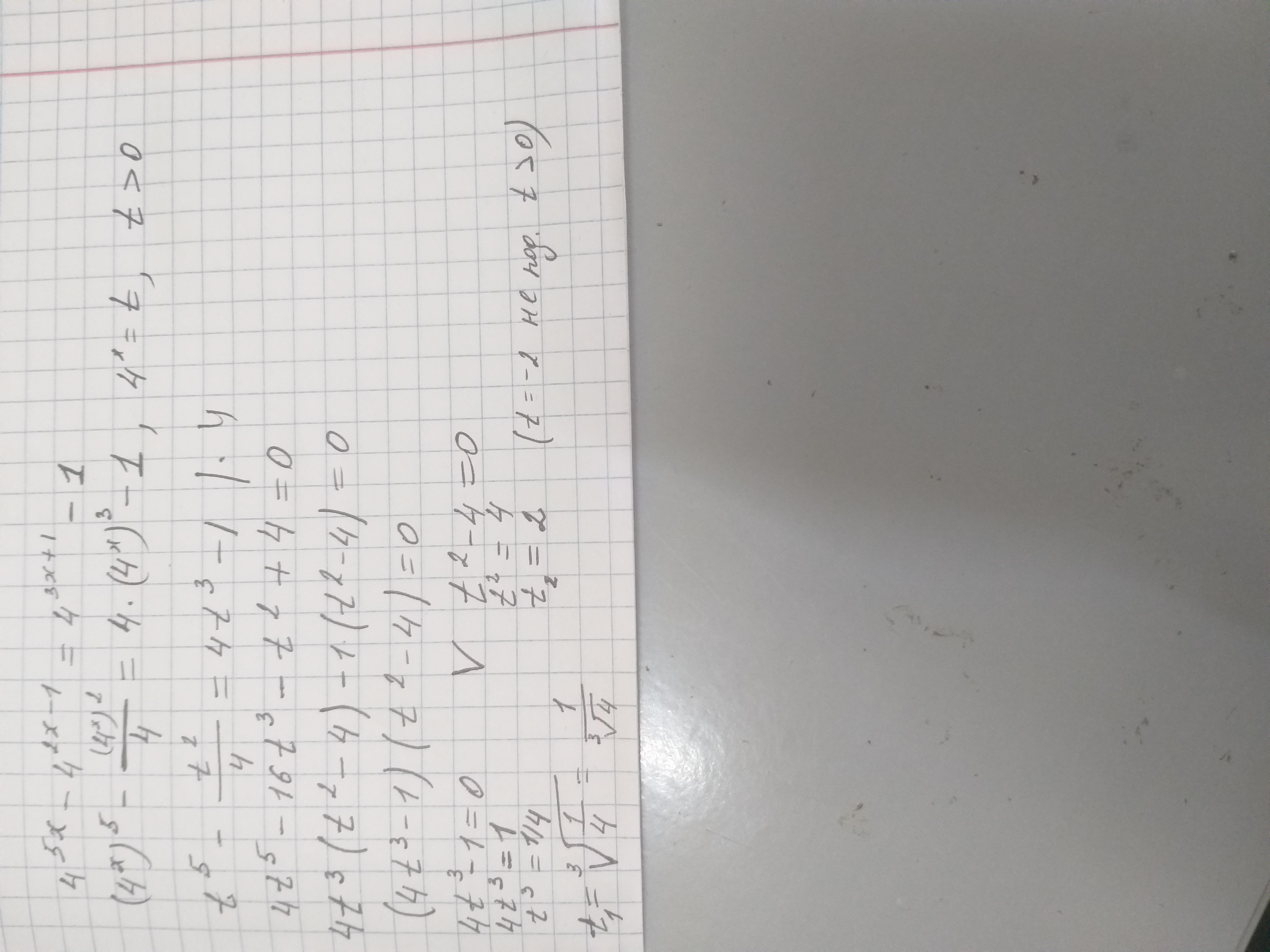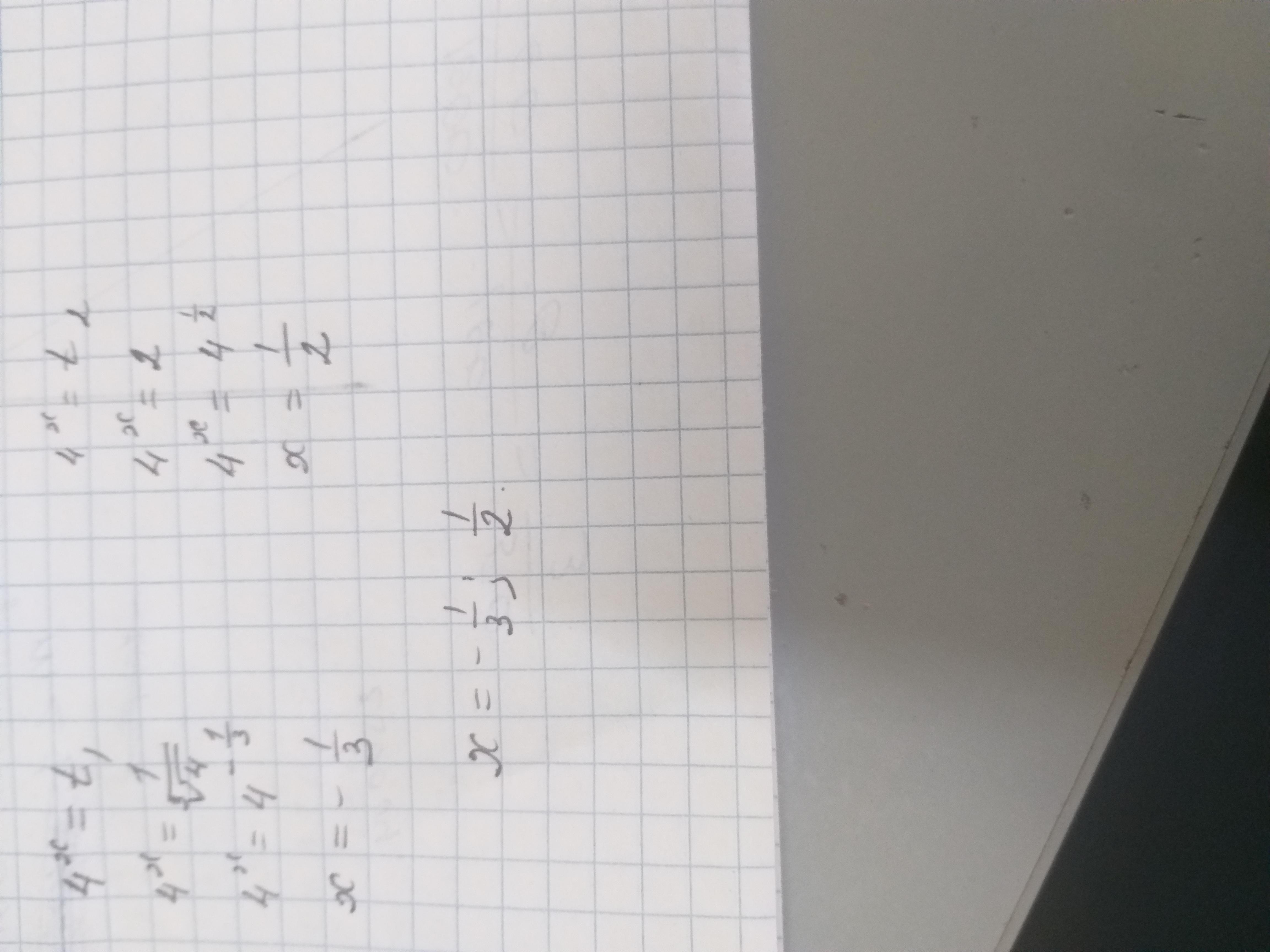 (у²-4)(4у³-1)=0⇒у²-4=0; у²=4; у₁,₂=±2; у₁=2; у₂=-2<0-посторонний корень. 4у³-1=0; у³=1/4; у₃=2⁻²/³; Возвратимся к старой переменной х, 4ˣ=2, 2²ˣ=2;⇒х=0.5; 4ˣ=2⁻²/³; 2²ˣ=2⁻²/³⇒2х=-2/3; х=-1/3