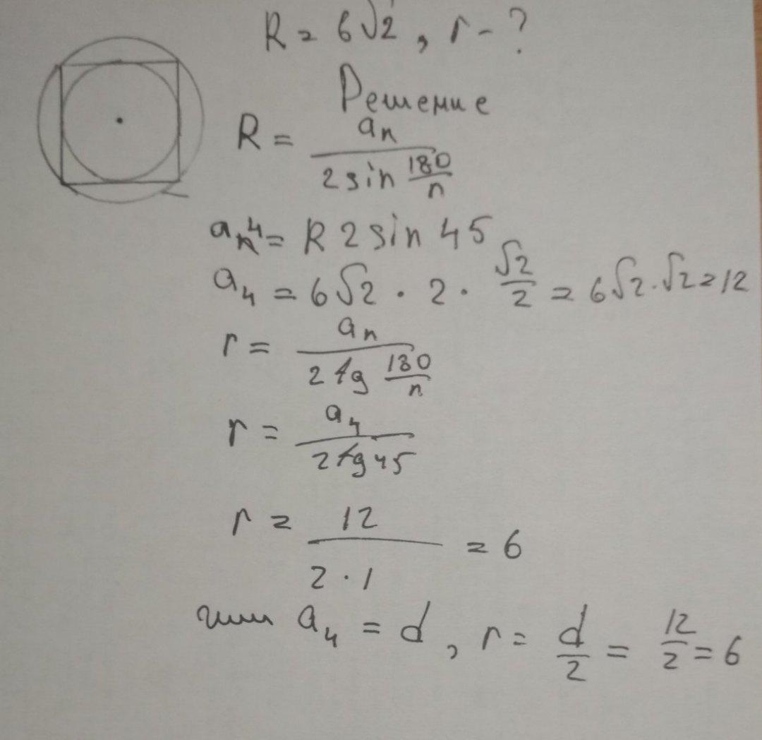 радиус описанной окружности равен 6 корней из 2 найти радиус вписанной окружности ( фигура квадрат)