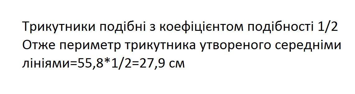Периметр трикутника дорівнює 55,8 см. Обчисліть периметр трикутника утвореного середніми лініями