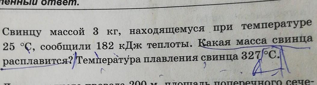 свинцу массой 3 кг, находящемуся при температуре 25 °C, сообщили 182 кДж теплоты. Какая масса свинца расплавится? Температура плавления свинца 327 °C.