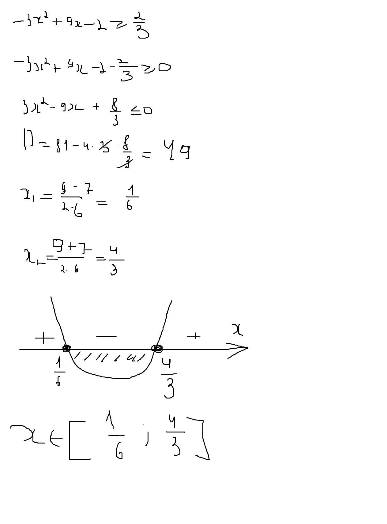 Ответ: переносим 2/3 влево со знаком минус:-3*х²+9*х-2 2/3>0⇒-3*x²+9*x-8/3>0