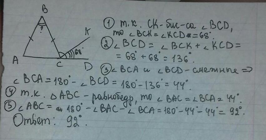 BCD - внешний угол равнобедренного треугольника ABC с основантем AC, CK - биссектриса угла BCD. Найдите угол ABC, если известно, что угол KCD = 68 градусов.