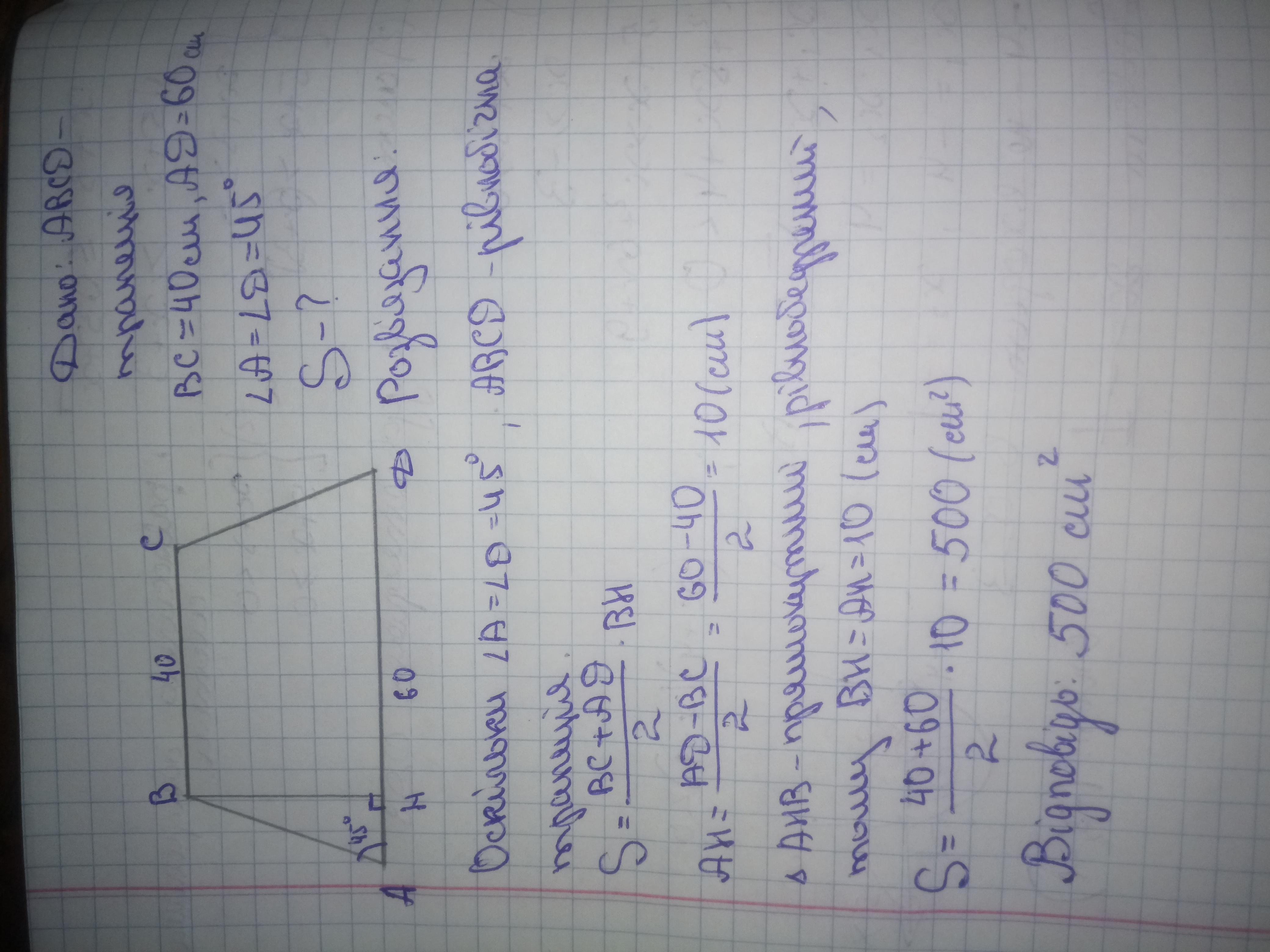 Средняя линия ее равна (40+60)/2=50/см/, если углы при основании равны по 45°, то это равнобедренная трапеция, и если провести из вершин тупых углов на большее основание высоты, то на большем основании окажется три отрезка, посредине 40 см, и по бокам по 10см, а т.к. углы при основании 45°, то высоты и будут равны этим отрезкам по 10 см, значит, площадь трапеции равна произведению средней линии на высоту, т.е. 50*10=500/см²/