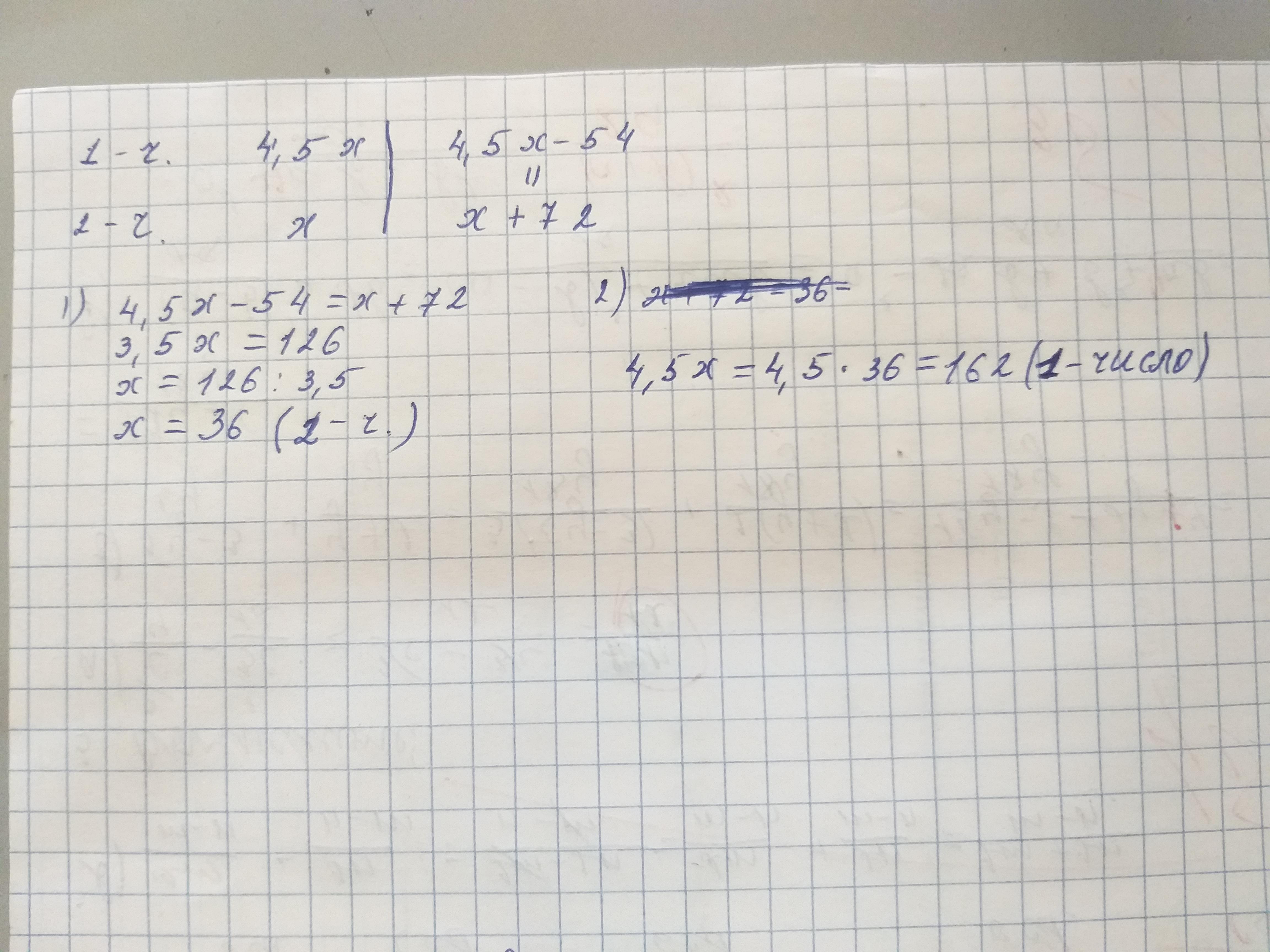 Одно число больше другого 4,5 раза если от большого числа отнят 54, к меньшему прибаит 72то получится одинаковы число.чему равна эти числы
