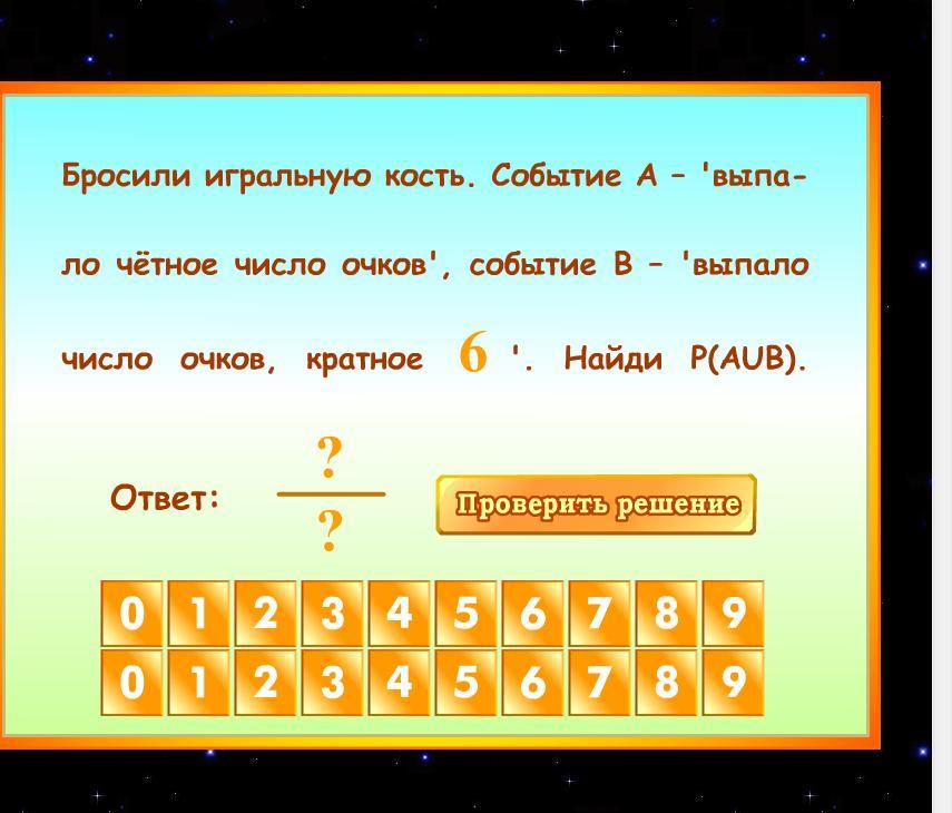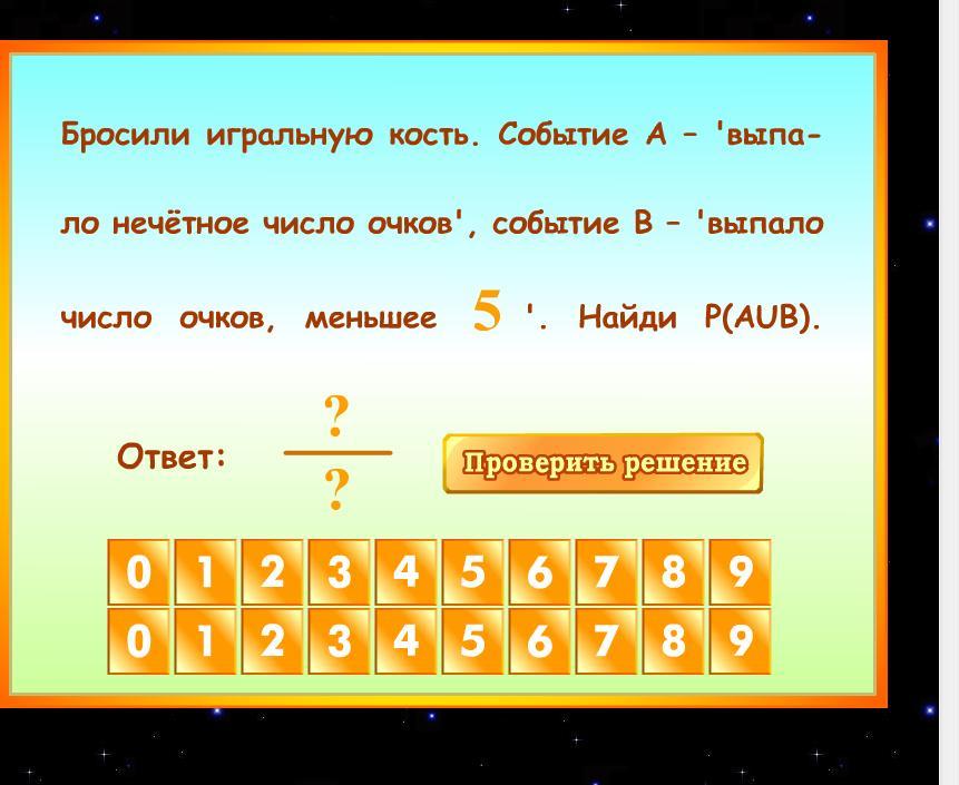 Событие А U B означает "выпало 1, 2, 3, 4 или 5"
