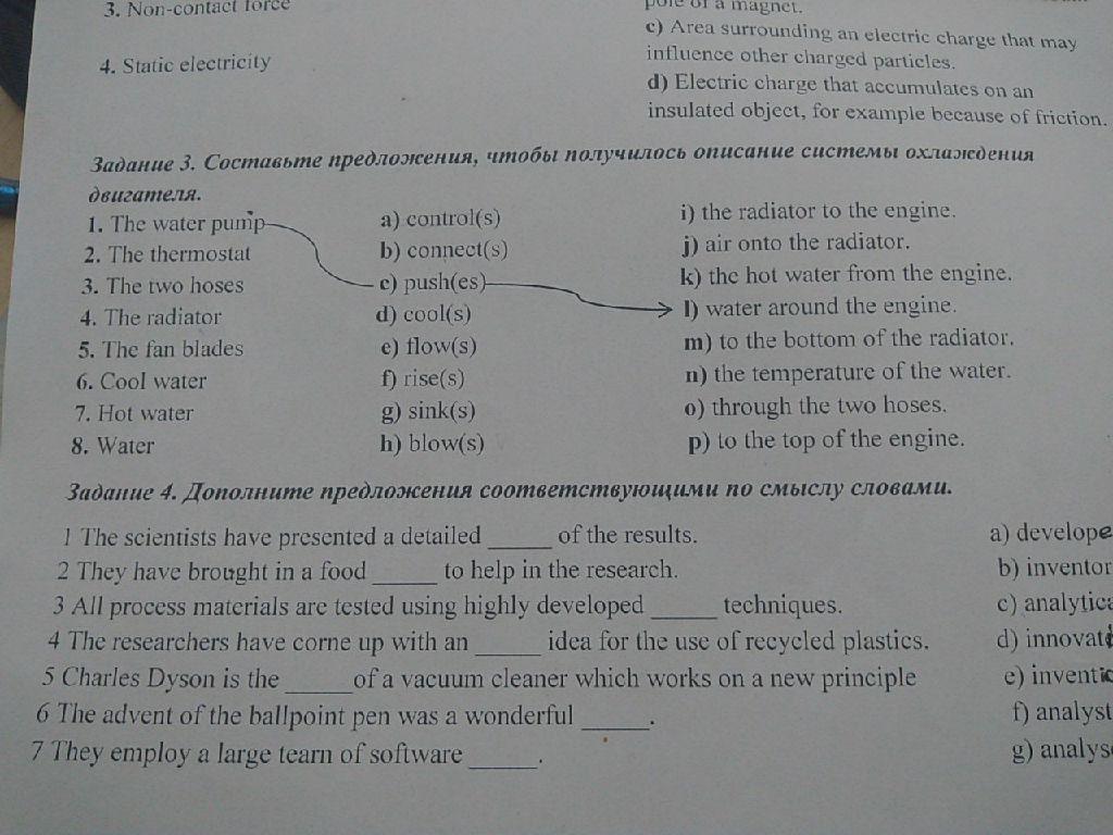 3 задание Помогите составить предложения, чтобы получилось описание системы охлиждения двигателя.