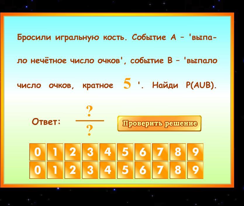 Используем классическое определение вероятности, получим Р(А)=3/6=1/2; Р(В)=1/6; Используем формулу суммы двух несовместных событий, получим Р(А∪В)=1/2+1/6=3/6+1/6=4/6=2/3