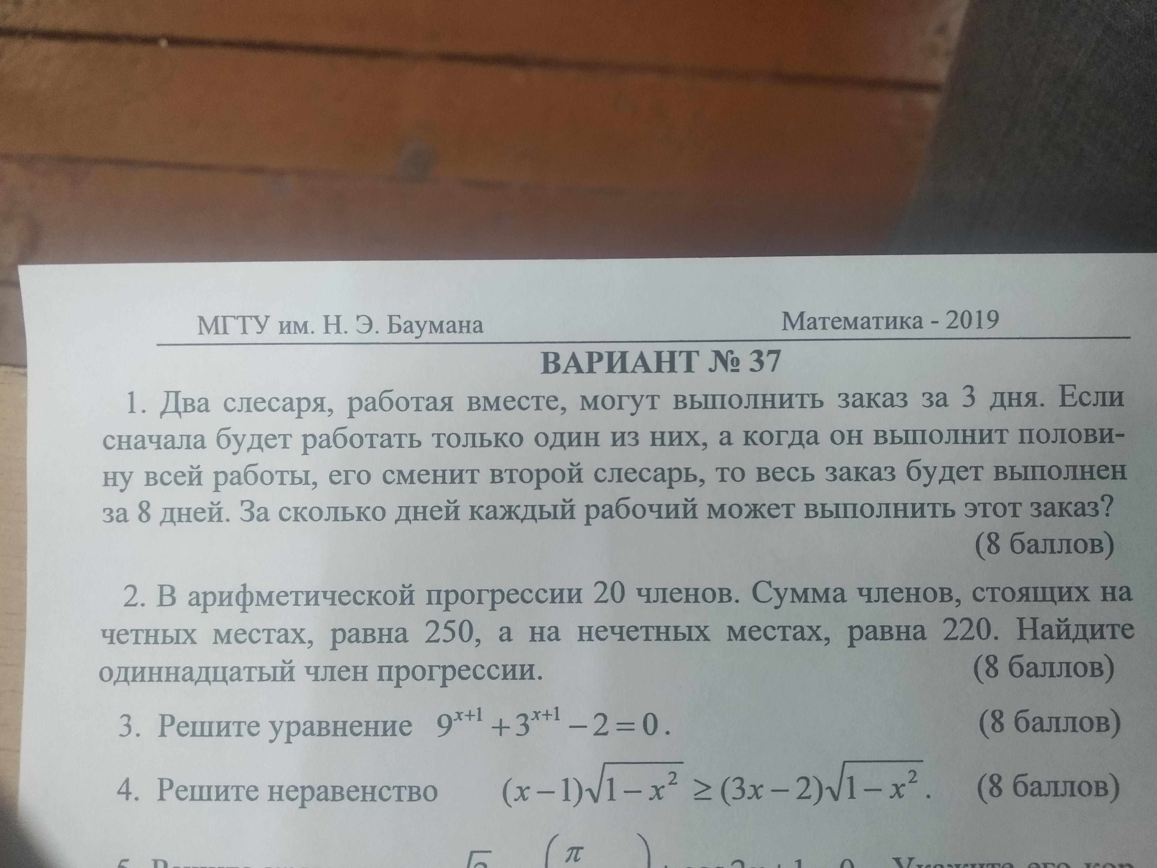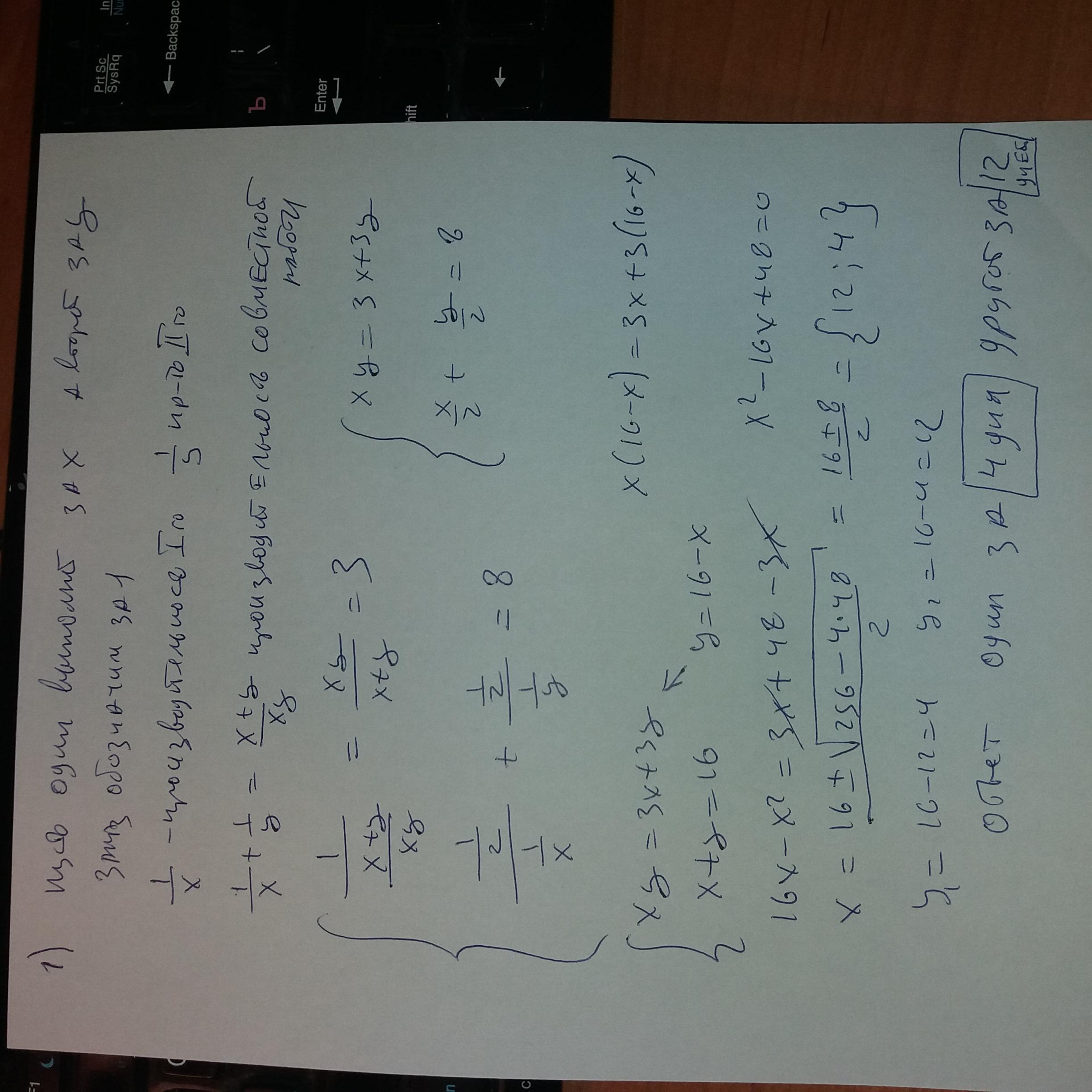 1. Пусть вся работа 1, первый выполнит всю работу за х дней, второй за у дней, тогда 1/х+1/у=1/3, согласно условия, выполнив половину работы, первый затратит 0.5/(1/х)=х/2 дней, а второй на вторую половину работы затратит 0.5/(у/2)=у/2 дней, составим второе уравнение. х/2+у/2=8, из которого получаем х+у=16, подставим в первое уравнение у=16-х и решим его. 1/(16-х)+1/х=1/3; х≠16, х≠0. 3*(16-х+х)=16х-х²; х²-16х+48=0, по теореме, обратной теореме Виета х₁=4; х₂=12, тогда у₁=12; у₂=4, т.е. если один выполнит задание за 4 дня, то второй за 12дней, и наоборот.