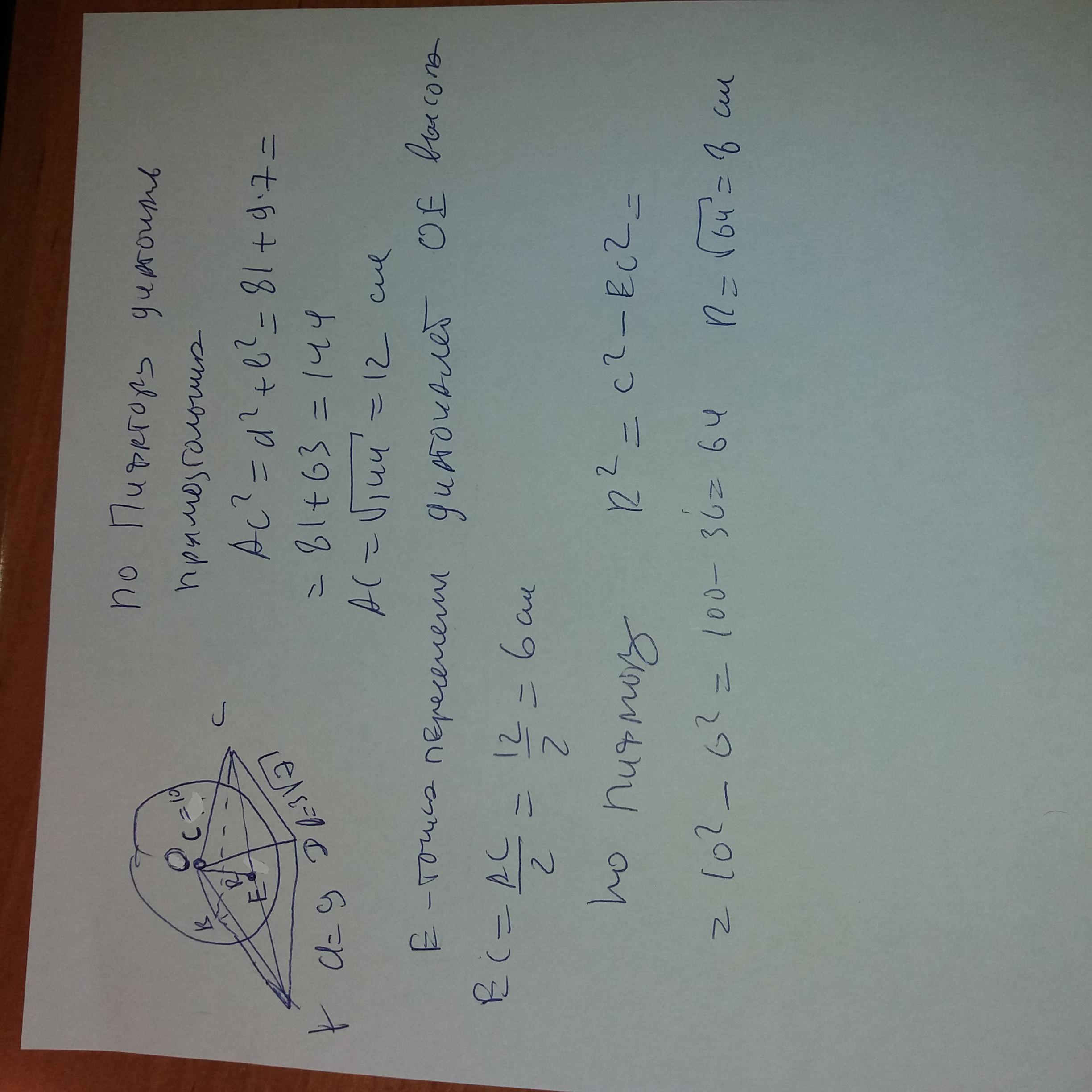 Прямоугольник, длины сторон которого равны 9 см и 3√7 см, касается сферы. Вычислите длину радиуса сферы, если известно, что её центр удалён от вершин прямоугольника на расстояние, равное 10 см.