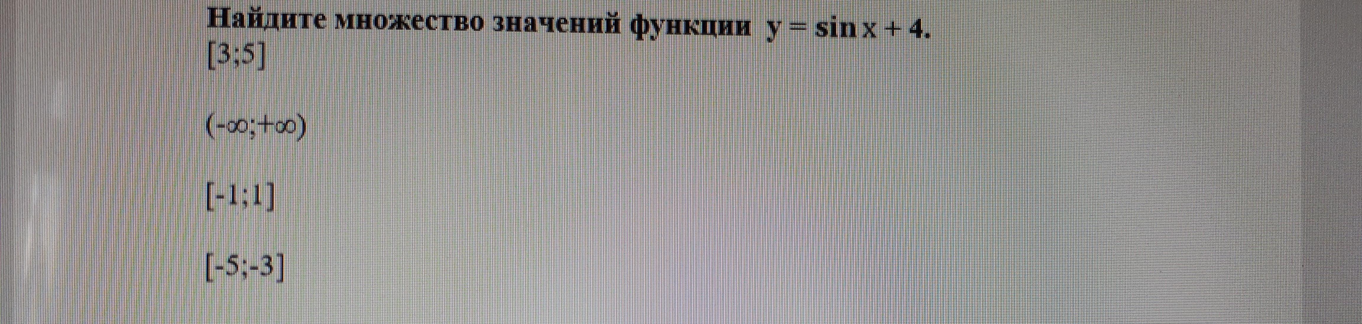 У обычного y=sinx область значений [-1;1], а тут еще к нему прибавляется 4, поэтому новая область значений [-1+4;1+4]=[3;5]