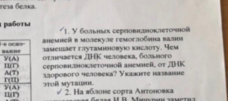 Триплет в ДНК здорового человека - ЦТТ, а у больного серповидноклеточной анемией - ЦАТ. Отличия, я думаю, видно.