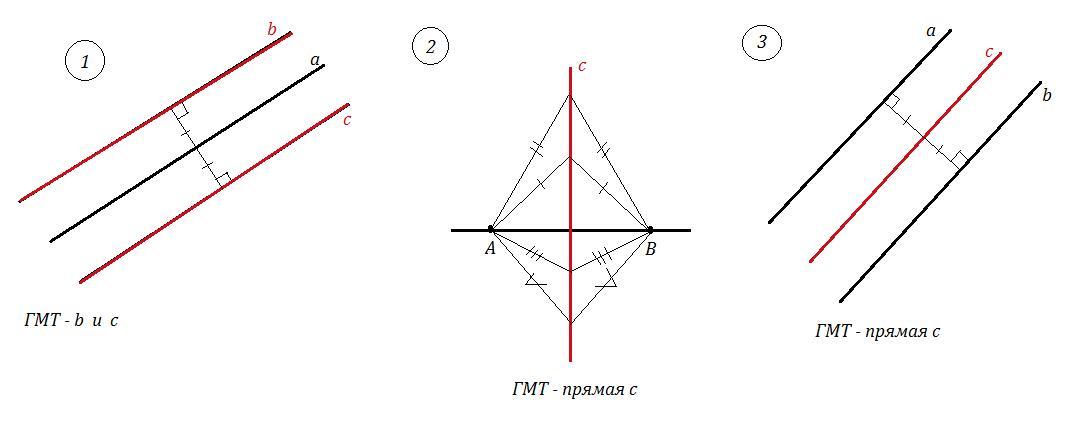 3) ГМТ, равноудаленных от двух параллельных прямых, — прямая, параллельная двум заданным параллельным прямым и находящаяся на одинаковом расстоянии от них (эта прямая проходит через середину их общего перпендикуляра).