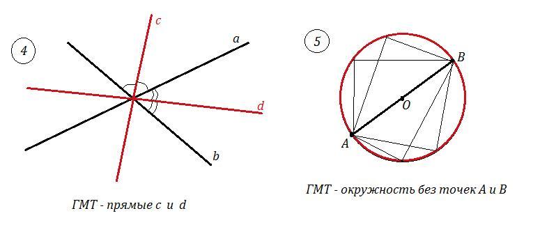 5) ГМТ, из которых данный отрезок АВ виден под прямым углом — окружность, с диаметром АВ, за исключением точек А и В.