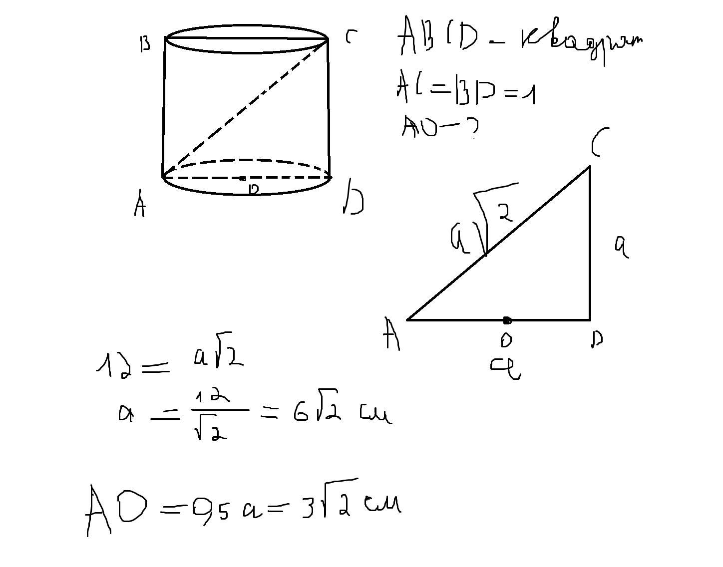 Осевое сечение цилиндра - квадрат, длина диагонали которого равна 12 см. Найдите радиус основания цилиндра.