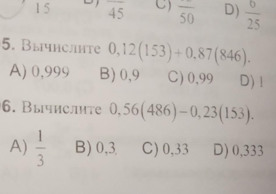 5) D ответа мне не видно ,но скорее всего он,так как А,В,С, не удовлетворяют требованиям примера .Ответ должен быть записан или так 0,9(9) ,или дробью.