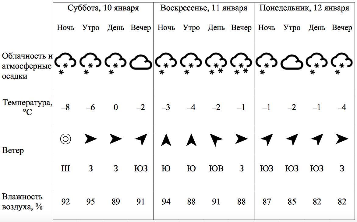 На интернет-сайтах погоды можно встретить подобные таблицы. Внимательно изучи прогноз погоды на трое суток.