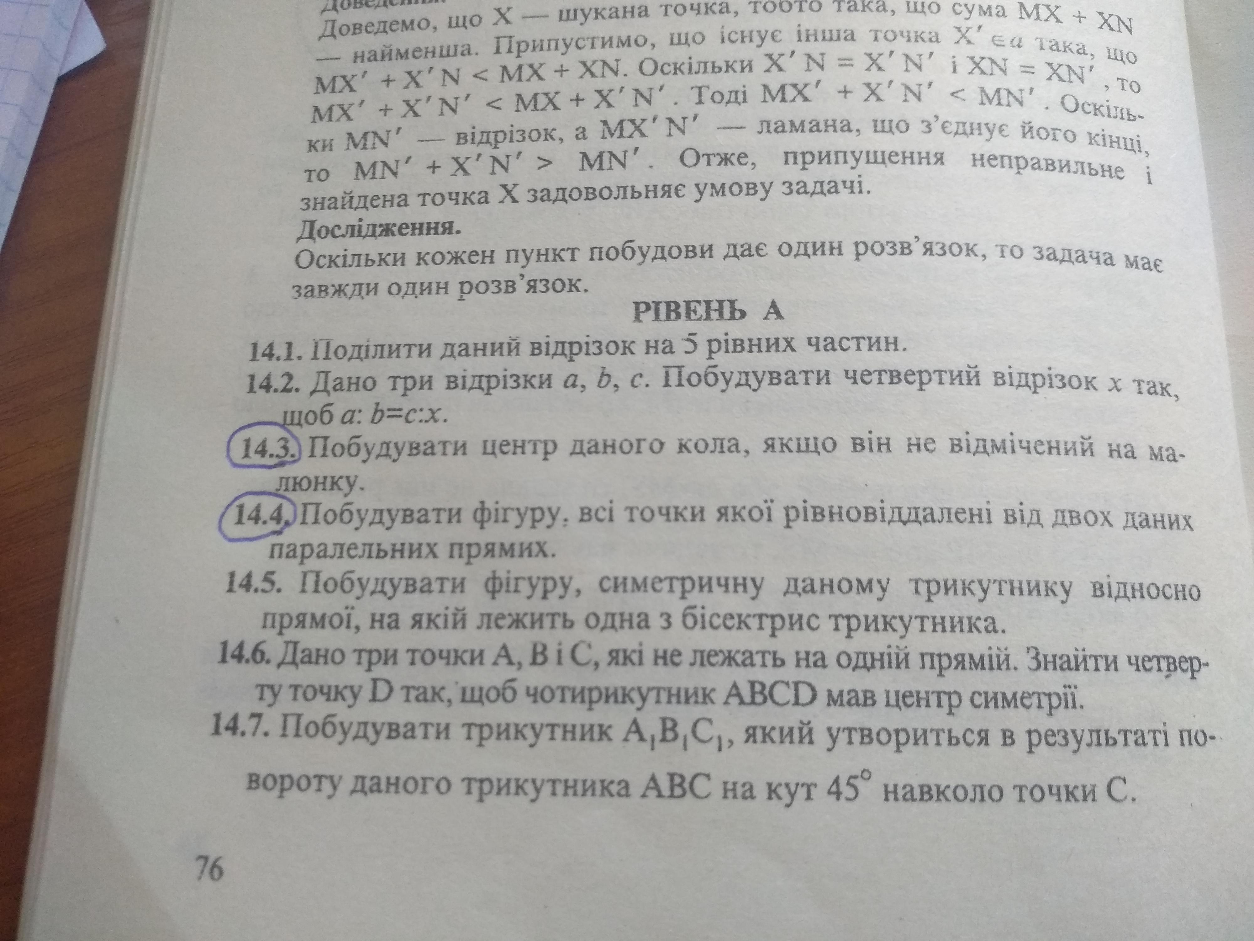 Пояснення: 1) малюєш 2 хорди любі на колі, проводиш на них серединні перпендикуляри. ТОЧКА іх перетину і є ЦЕНТР КОЛА 2) Фігура , точки якої рівновіддалені від 2 паралелельних прямих є ТРЕТЯ паралельна пряма! Проводь паралельну пряму на одинаковый выдстаны від тих двох (по середині) . ЦЕ І Є ТА ФІГУРА