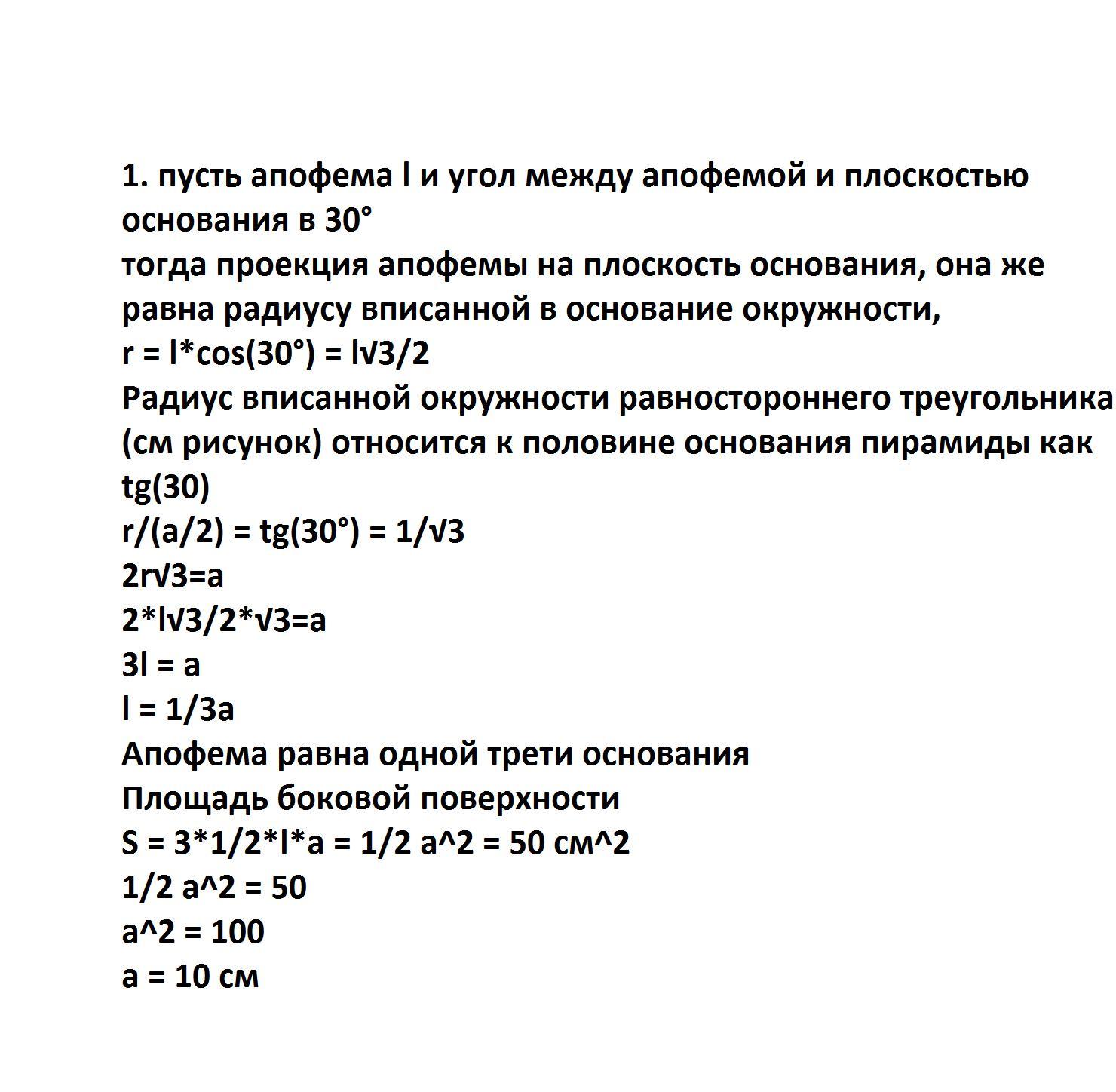 Площадь боковой поверхности правильной треугольной пирамиды равен 50.Угол наклона боковой грани к плосскости основаеия равен 30.Найти сторону основания пирамиды