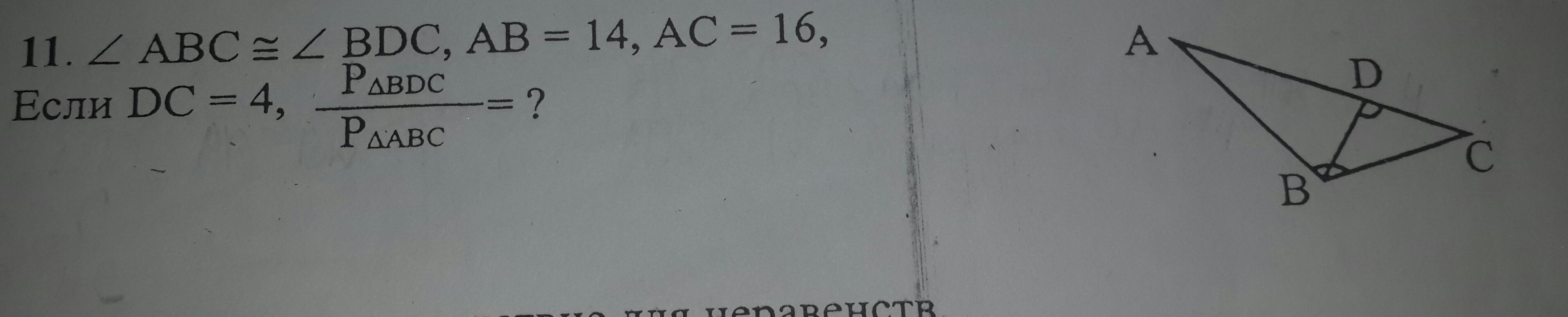 Угол АВС ~ уголBDC, AB=14, AC=16, Если DC =4,то чему равно P (треуг-ка BDC /P (треуг-ка ABC)=?