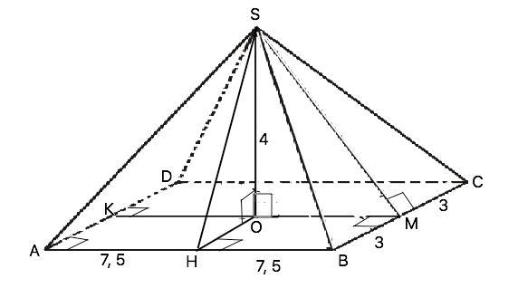 Высоты SМ и SН боковых граней перпендикулярны сторонам основания, их проекции по т. о 3-х перпендикулярах перпендикулярны сторонам основания, параллельны соответствующим сторонам прямоугольника и равны их половине. ОМ=СВ:2=3, ОН=АВ:2=7,5.