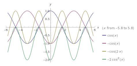 Третье. Рисуем y=cosx, потом делаем зеркальное отображение каждой точки, беря ось у как зеркало, потом сжимаем два раза вдоль оси х и переносим на 1 единицу вниз.