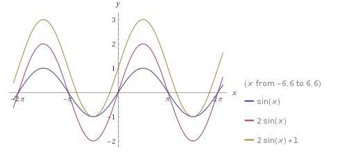 Второе. Рисуем y=sinx, потом растягиваем в два раза график вдоль оси у и поднимаем на 1 единицу вверх.