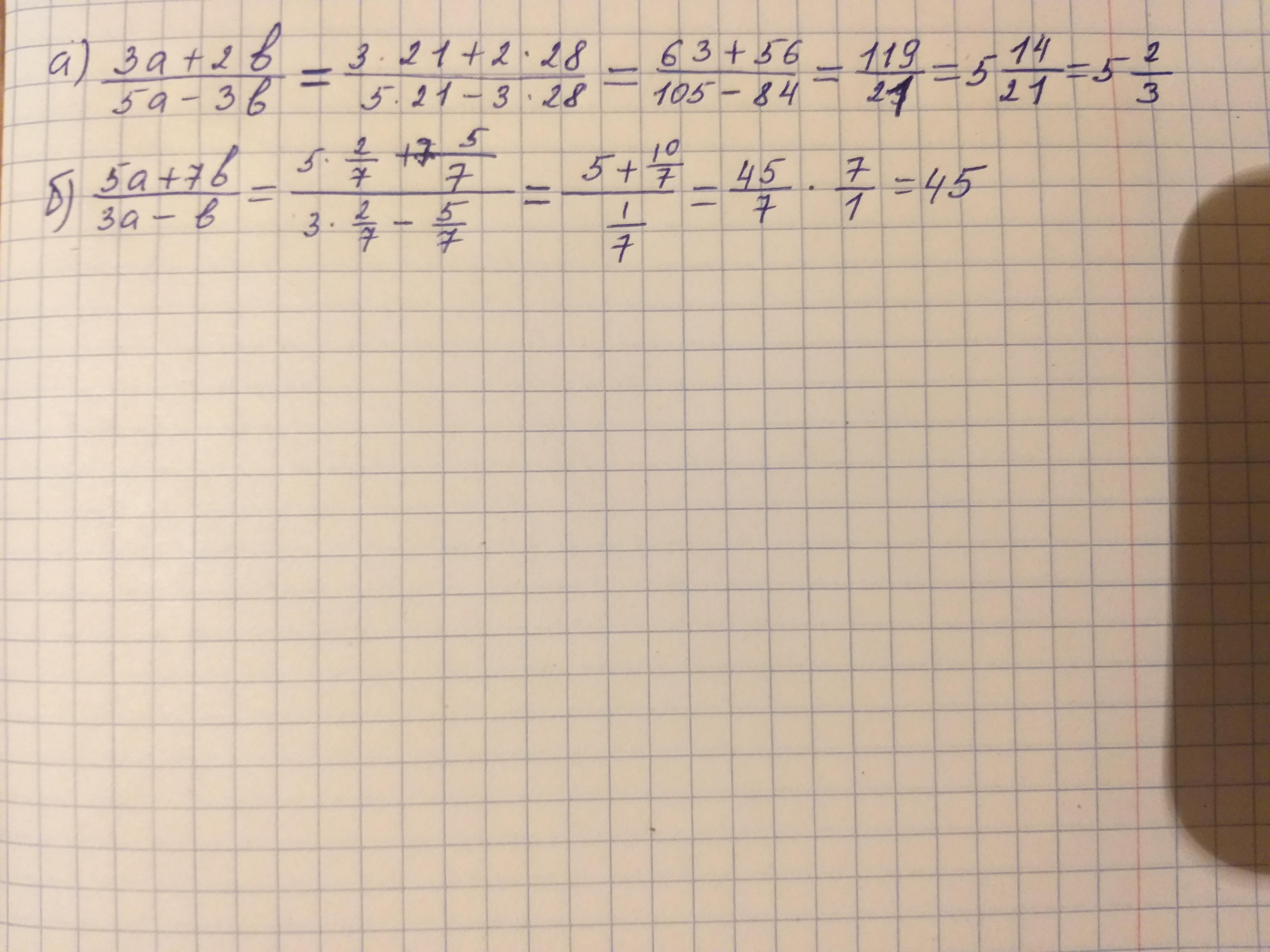 Найдите значение алгебраических дробей при данных значениях переменных:а)3а+2б/5а-3б при а=21;б=28