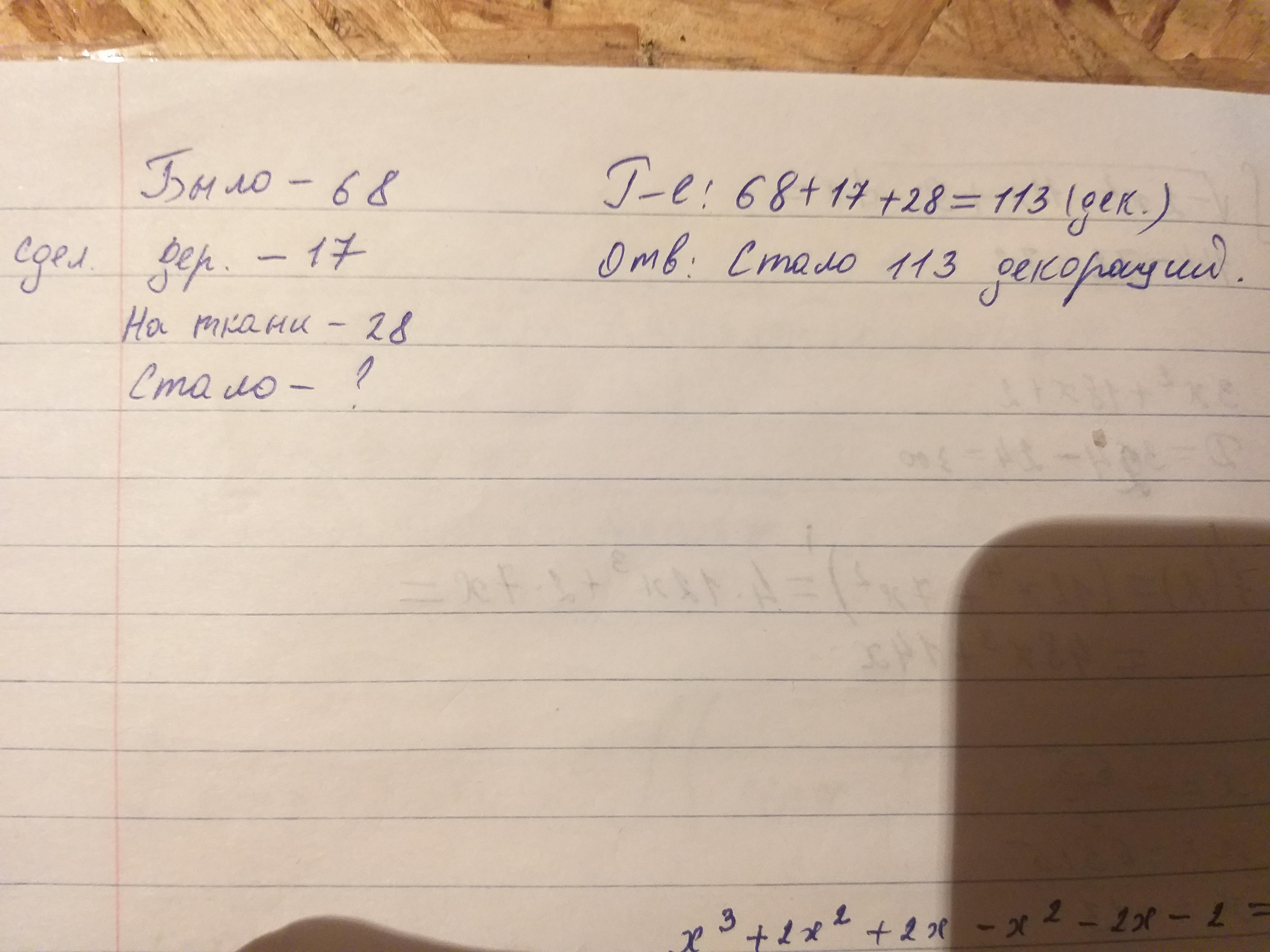 В театре было 68 декораций. К открытию сезона сделали новые 17 деревянных и 28 - на ткани. Сколько декораций стало в театре?