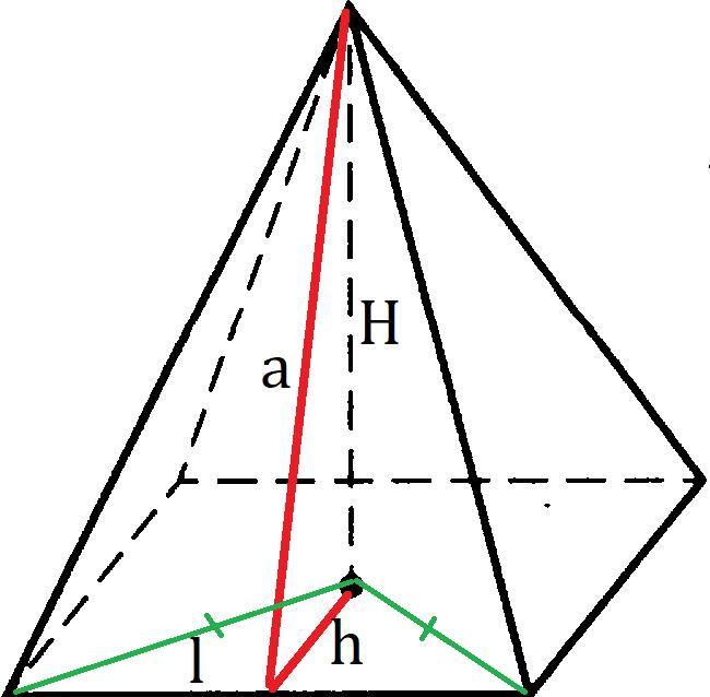 У правильной четырёхугольной пирамиды в основании лежит квадрат, а основание высота пирамиды является центром квадрата. Зная сторону квадрата (l) можно найти его диагональ - 10√2. Найдём высоту (в одном из 4 треугольников, которые образуются при пересечении диагоналей квадрата) из середины квадрата: