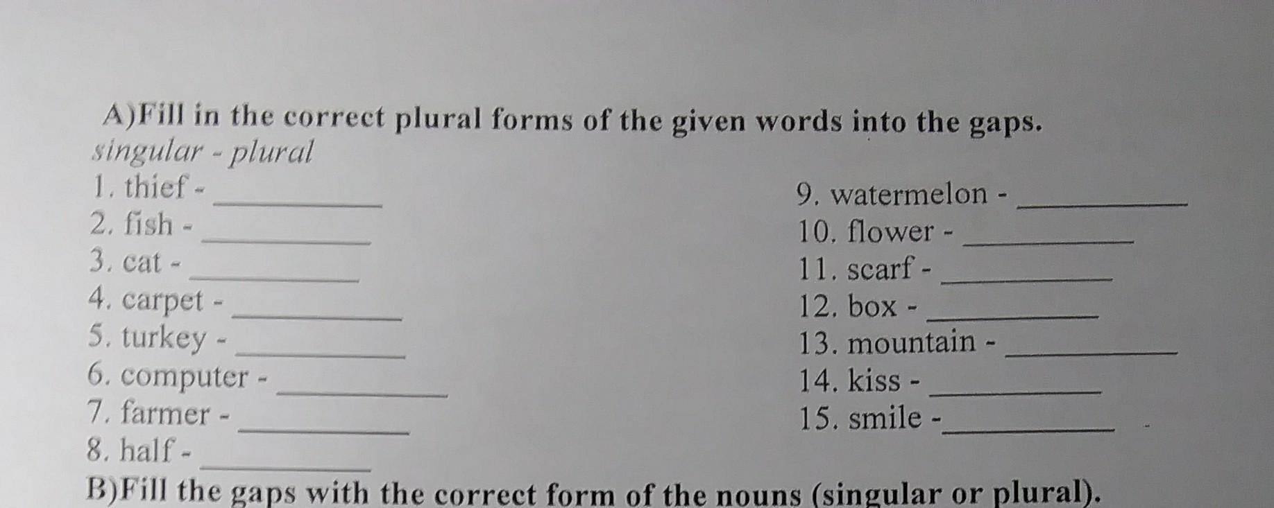 1Thiefs 2fish 3cats 4carpets 5turkeys 6computers 7farmers 8halves 9watermelons 10flowers 11scarfs 12boxes 13mountains 14kisses 15smiles